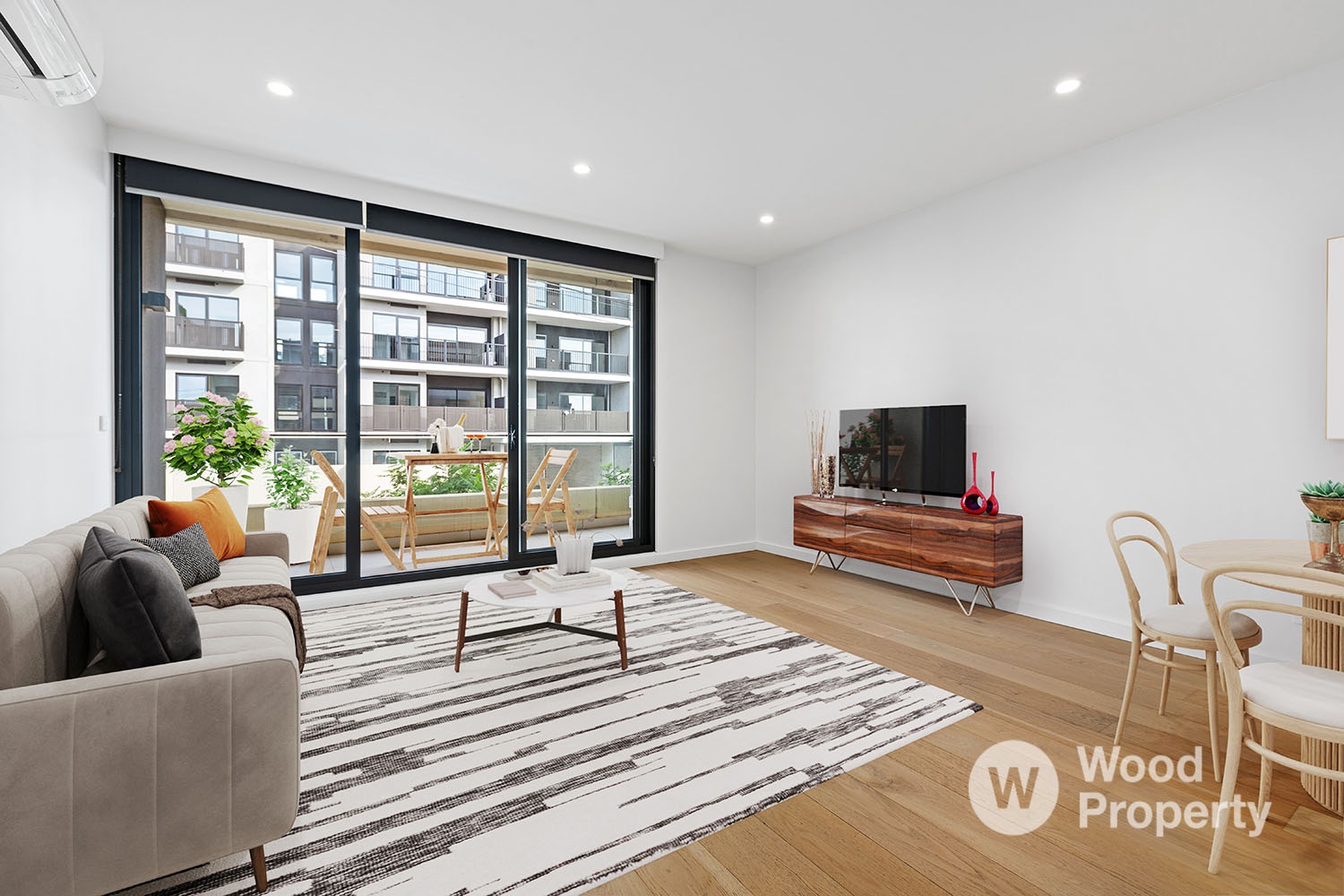 A wide and welcoming entrance hall featuring engineered Oak floors leads to a light-filled open-plan living and dining adjoining your private balcony for relaxing or entertaining.