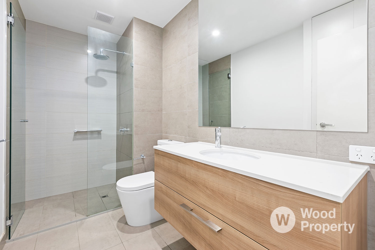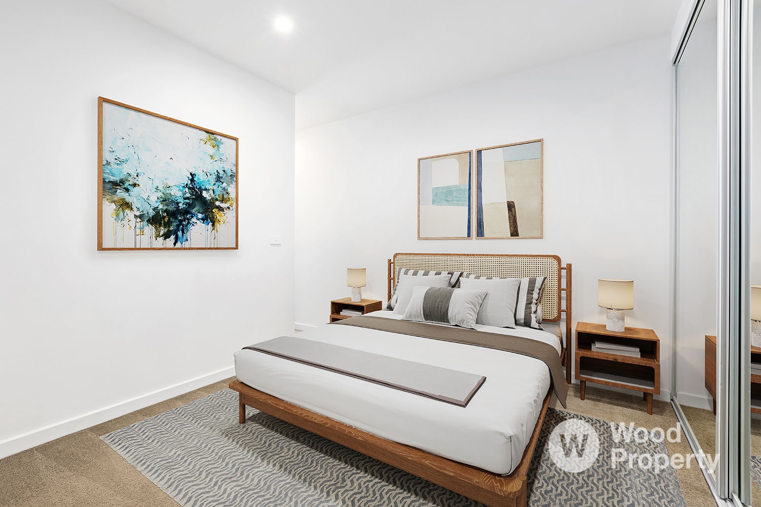 The spacious bedroom features mirrored built-in robes and is serviced by a luxe bathroom.
